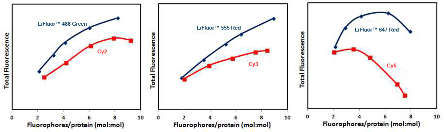 Comparison of relative fluorescence of goat anti-rabbit IgG antibody conjugates of LiFluor™ dyes and Cy dyes at different dye: protein ratios in the conjugate.
