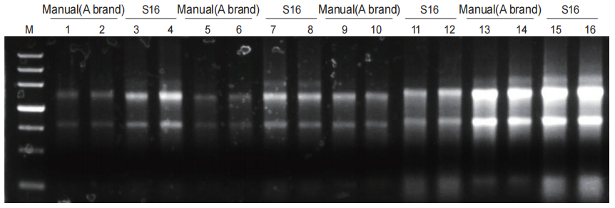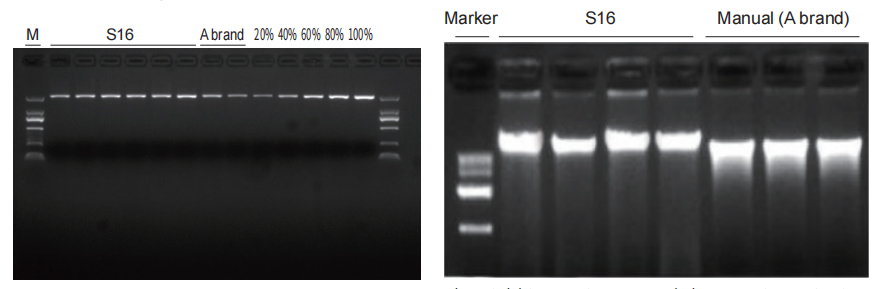 Plant (wheat root) DNA extraction (Right) The yield is consistent, and the DNA integrity is better than of the manual column extraction kit.