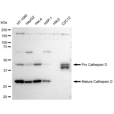 Reactivity: Human, Mouse Applications: WB, WB-KD Isotype: IgG Clone: 23GB3340 Host Species: Rabbit Clonality: Monoclonal Synonyms: CTSD; Cathepsin D; CLN10; CPSD; Ceroid-Lipofuscinosis, Neuronal 10; EC 3.4.23.5; Epididymis Secretory..