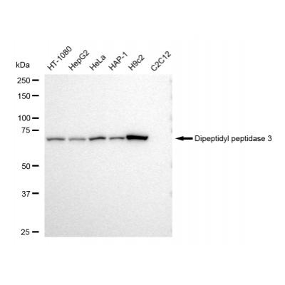 Reactivity: Human, Rat Applications: WB, FCM, WB-KD Isotype: IgG Clone: 23GB5190 Host Species: Rabbit Clonality: Monoclonal Synonyms: DPP3; Dipeptidyl Peptidase 3; Enkephalinase B; Dipeptidyl Aminopeptidase III; Dipeptidyl Arylamida..