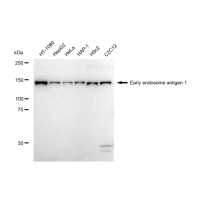 Reactivity: Human, Mouse, Rat Applications: WB, FCM, WB-KD Isotype: IgG Clone: 23GB5260 Host Species: Rabbit Clonality: Monoclonal Synonyms: EEA1; Early Endosome Antigen 1; ZFYVE2; Zinc Finger FYVE Domain-Containing Protein; Endosom..