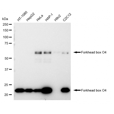 Reactivity: Human, Mouse, Rat Applications: WB, IF/IC, WB-KD Isotype: IgG Clone: 23GB850 Host Species: Rabbit Clonality: Monoclonal Synonyms: Forkhead Box O1; FOXO1A; FKH1; FKHR; Forkhead Box Protein O1A; Forkhead Box Protein O1; Fo..