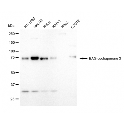 Reactivity: Human, Mouse Applications: WB, IF/IC, FCM, WB-KD Isotype: IgG Clone: 23GB1520 Host Species: Rabbit Clonality: Monoclonal Synonyms: BAG3; BAG Cochaperone 3; BAG Family Molecular Chaperone Regulator 3; BCL2 Associated Atha..