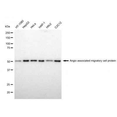 Reactivity: Human, Mouse, Rat Applications: WB, WB-KD Isotype: IgG Clone: 23GB1885 Host Species: Rabbit Clonality: Monoclonal Synonyms: Angio Associated Migratory Cell Protein; Angio-Associated Migratory Cell ProteinImmunogen: A syn..