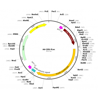 Product Category: Human Adenovirus Type5 (dE1/E3); Ad-CMV-Luc; Ad-Luc Gene Name: Firefly luciferase Summary: This adenovirus expresses firefly luciferase under CMV promoter. Promote..
