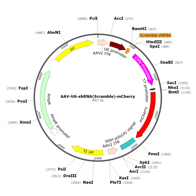 Product Category: Premade recombinant AAV; AAV-U6-shRNA(Scramble)-CMV-mCherry; AAV1-U6-shRNA(Scramble)-CMV-mCherry; AAV-U6-shRNA(Scramble)-mCherry; AAV1-U6-shRNA(Scramble)-mCherry Description: AAV1-U..