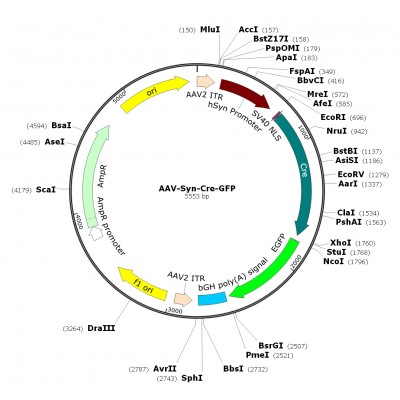 Product Category: Premade recombinant AAV; AAV-Synapsin-Cre-GFP; AAV9-Synapsin-Cre-GFP (Cre fusion with GFP) Description: AAV9-Syn-Cre-GFP is the serotype 9 AAV which express Cre recombinase fusion w..