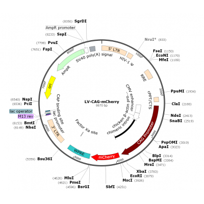 Product Category: Premade recombinant lentivirus; LV-CAG-mCherry; LV-CBA-mCherry; CAG-mCherry Lentivirus Description: Lentivirus CAG-mCherry is pre-made lentivirus which express mCherry under the CAG..