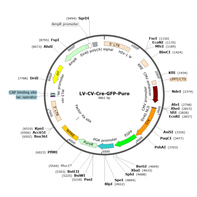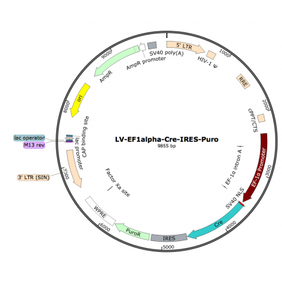 Product Category: Premade recombinant lentivirus; LV-CMV-Cre-GFP-Puro; LV-CMV-Cre-GFP-PGK-Puro; CMV-Cre-GFP Lentivirus Description: Cre recombinase is a type I topoisomerase from bacteriophage P1..