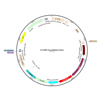 Product Category: Premade recombinant lentivirus; LV-CMV-Cre-mCherry-Puro; LV-CMV-Cre-mCherry-PGK-Puro; CMV-Cre-mCherry Lentivirus Description: Cre recombinase is a type I topoisomerase from bacteriophage P1 that cataly..