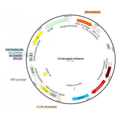 Product Category: Premade recombinant lentivirus; LV-Synapsin-mCherry; LV-Syn-mCherry; LV-hSyn-mCherry; Syanpsin-mCherry Lentivirus Description: Lentivirus Synapsin-mCherry is pre-made lentivirus whi..