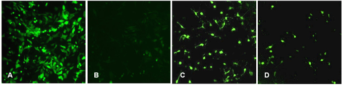 Figure C & D. Comparison of LiFect2K™ and Lipofectamine 2000 in plasmid transfection on mouse neuronal cells. Mouse neuronal cells were transfected with a GFP-expressing plasmid using either LiFect2K™ transfection reagent (C), or Lipofectamine 2000 (D). Cells were visualized 48 hours post-transfection under fluorescence microscopy (GFP filter).