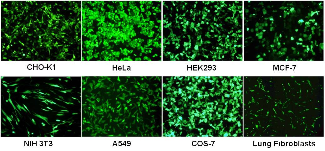 Assessment of LiFect2K™ transfection efficiencies using GFP visualization. 8 commonly-used cell lines were transfected with a GFP-expressing plasmid using LiFect2K™ transfection reagent. Cells were visualized 48 hours post-transfection under fluorescence microscopy (GFP filter).